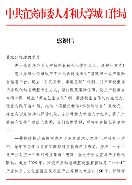 在1月18-21日宜宾市政协第六届六次会议上,我校九三学社委员会副主委、宜宾市政协委员宗绪岩教授在分组讨论发言,得到宜宾市委书记方存好的高度肯定,并收到宜宾市的感谢信。