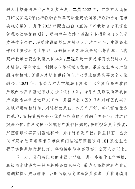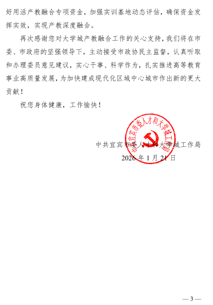 方存好书记认为宗绪岩教授的发言紧扣宜宾产教融合试点建设实际,精准剖析供需、协同、保障评价三大核心问题,提出的信息对接、政策激励、平台优化三项建议务实可行,为赋能城市高质量发展提供了有力思路。